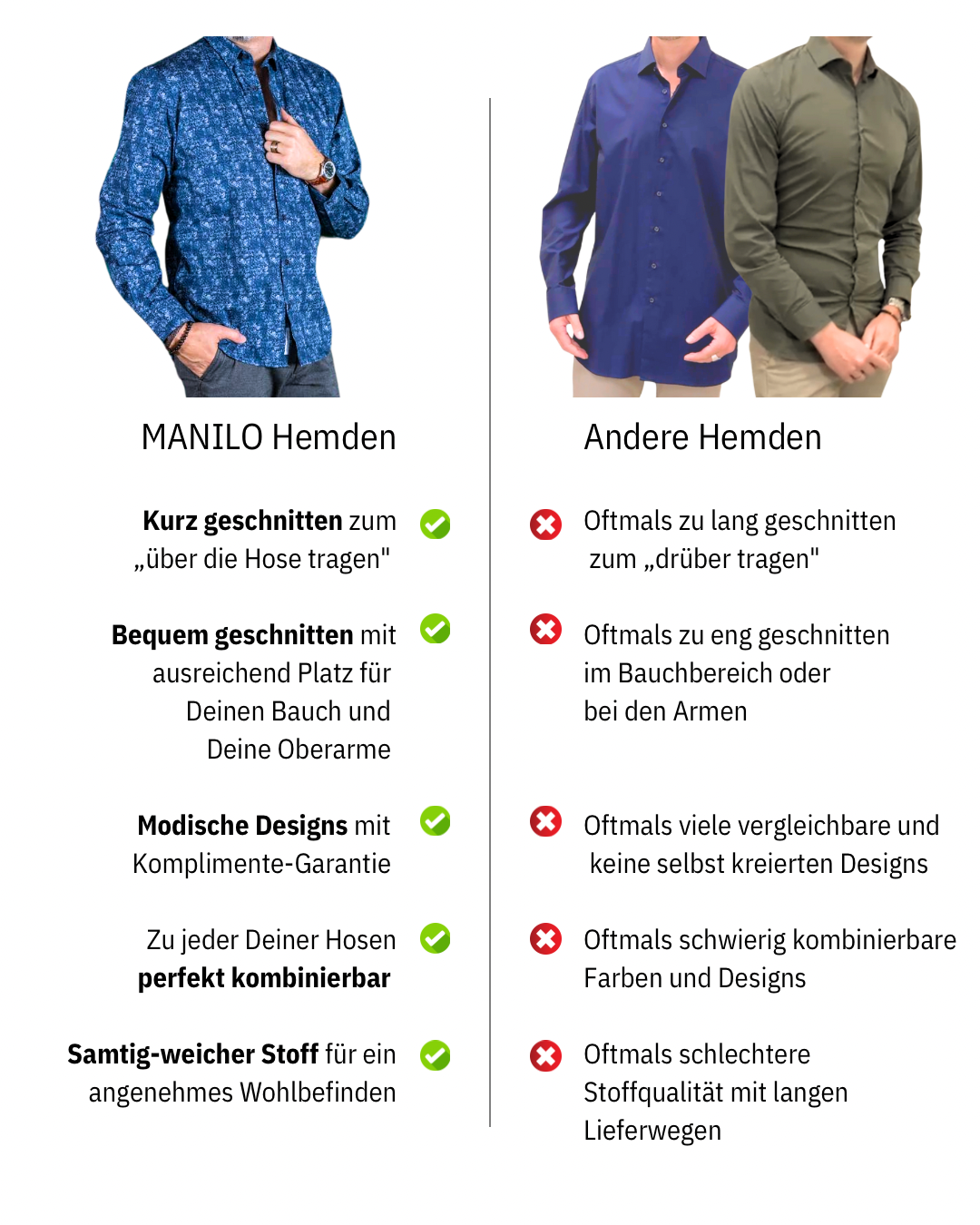 Unser Versprechen: MANILO gibt Dir nicht nur eine "Wohlfühl-", sondern auch eine "Komplimente-Garantie". In der MANILO Bluse oder im MANILO Hemd fühlst Du Dich nicht nur zu 100% wohl, sondern Du wirst auch Komplimente erhalten. Garantiert! Davon sind wir so überzeugt, dass Du Dein Geld zurück bekommst, falls Du mit dem Produkt nicht zufrieden bist.